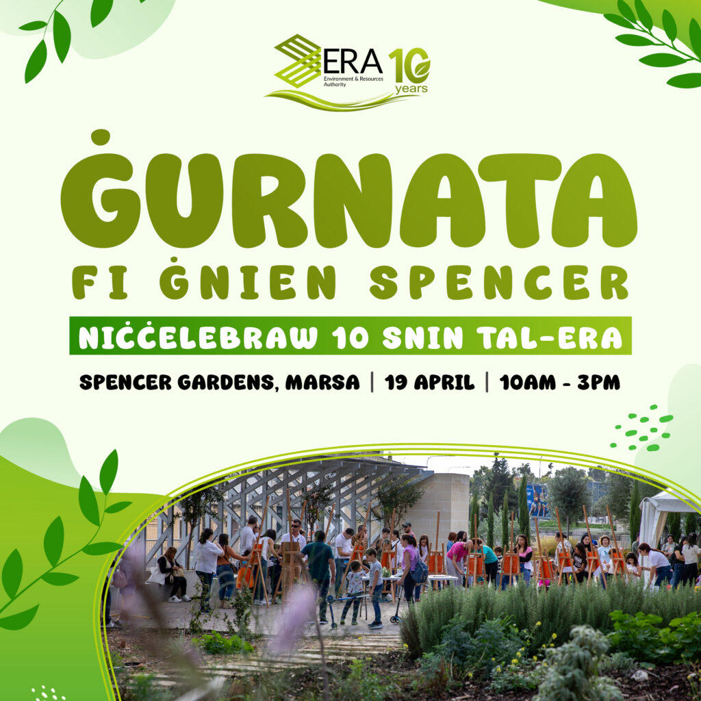 Ġurnata speċjali għall-familja kollha se ssir nhar il-Ħadd 19 ta’ April fi Ġnien Spencer, il-Marsa, hekk kif l-Awtorità għall-Ambjent u r-Riżorsi (ERA) qed tiċċelebra għaxar snin mit-twaqqif tagħha b’avveniment miftuħ għall-pubbliku – Ġurnata fi Ġnien Spencer.
