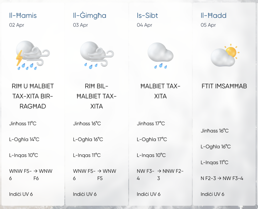 Il-jum tal-Ħamis mistenni jġib miegħu wkoll riħ qawwi li se jkun qiegħed saħansitra jilħaq il-qawwa ta’ forza 7.