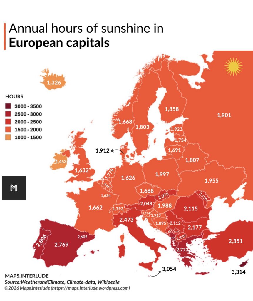 Ċipru, l-Italja, il-Portugall, il-Greċja kif ukoll Spanja huma fost dawk il-pajjiżi li wkoll jesperjenzaw għadd sostanzjali ta’ xemx matul is-sena kollha.