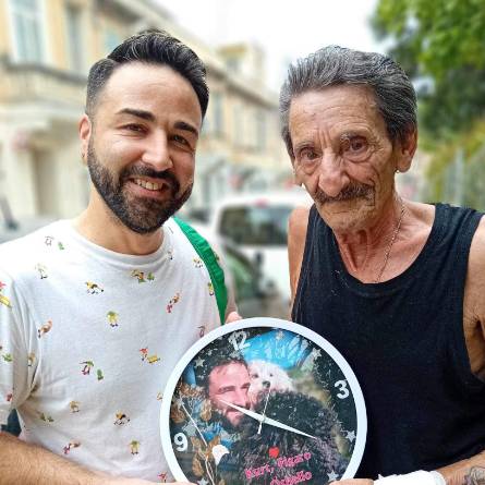 B’mod ċajtier qal, “Issa ħa nara fejn ħa ndendlu!” Fuq l-arloġġ, hemm ritratt ta’ Kurt mal-klieb tiegħu, Figaro u Othello, li tant huma għal qalbu!