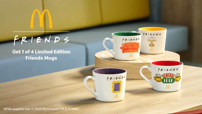 Barra minn hekk, erba’ mugs u tote bags ispirati minn FRIENDS se jkunu disponibbli wkoll għal żmien limitat esklussiviment mill-app. Dawn jistgħu jiġu mifdija permezz tal-app ta’ McDonald’s għal 800 punt għal kull mug u 600 punt għal kull tote bag.