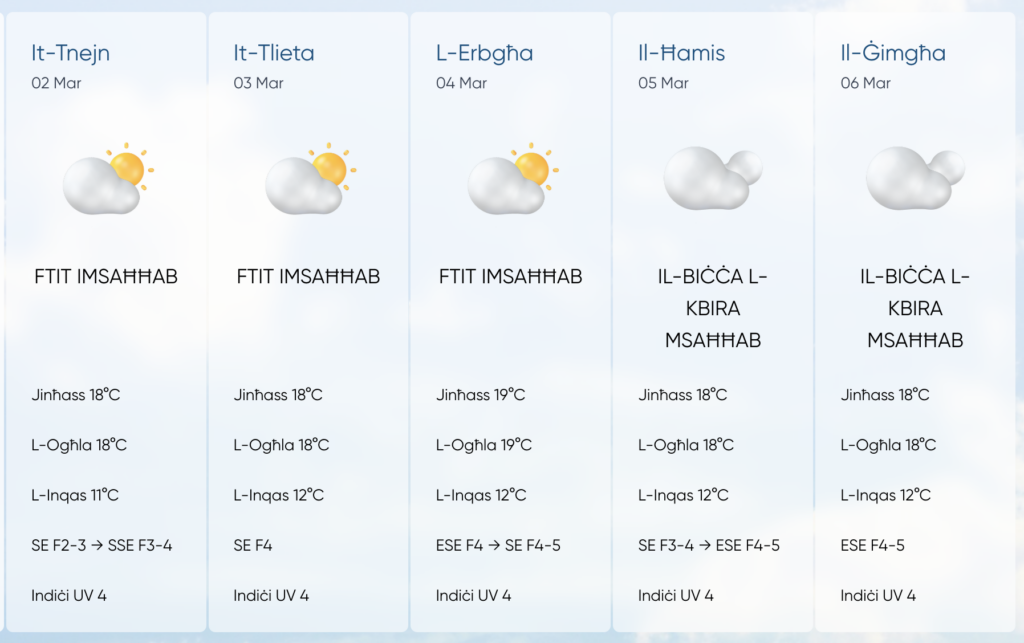 L-Uffiċju Meteroloġiku ta’ pajjiżna qed ibassar li l-ġimgħa d-dieħla se tkun qed iġġib magħha temp imsaħħab fil-parti l-kbira tagħha filwaqt li l-ebda ħalbiet tax-xita jew riħ qawwi m’huma mistennija jolqtu lill-gżejjer Maltin.