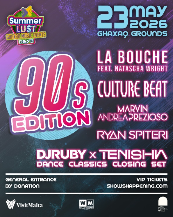 Dan is-sajf, fit-23 ta’ Mejju, dawk kollha li jħobbu l-mużika huma mistiedna jerġgħu lura fiż-żmien hekk kif Summer Lust – 90’s Edition jerġa’ jittella’ fil-Grounds ta’ Ħal Għaxaq. Ċelebrazzjoni memorabbli tad-disgħinijiet b’artisti leġġendarji, suċċessi ikonici u atmosfera impekkabbli.