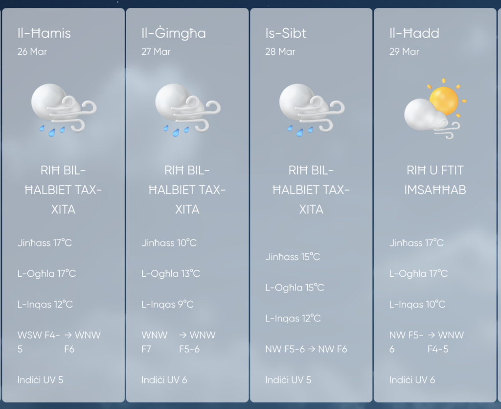 Skont it-tbassir tal-Uffiċju Meteroloġiku ta’ pajjiżna, il-gżejjer Maltin fit-tlett ijiem li ġejjin se jkunu qed jintlaqtu ta’ kuljum mill-ħalbiet tax-xita. Dan filwaqt li r-riħ se jkun qiegħed ukoll jitqawwa u jilħaq il-forza 7. F’ċerti waqtiet it-temperatura se tkun qiegħda wkoll tinżel għal 9°C.
